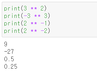 ** 을 이용해서 '**' 기준 왼쪽 값은 본래의 값이고 '**' 기준 오른쪽 값은 제곱을 할 숫자입니다